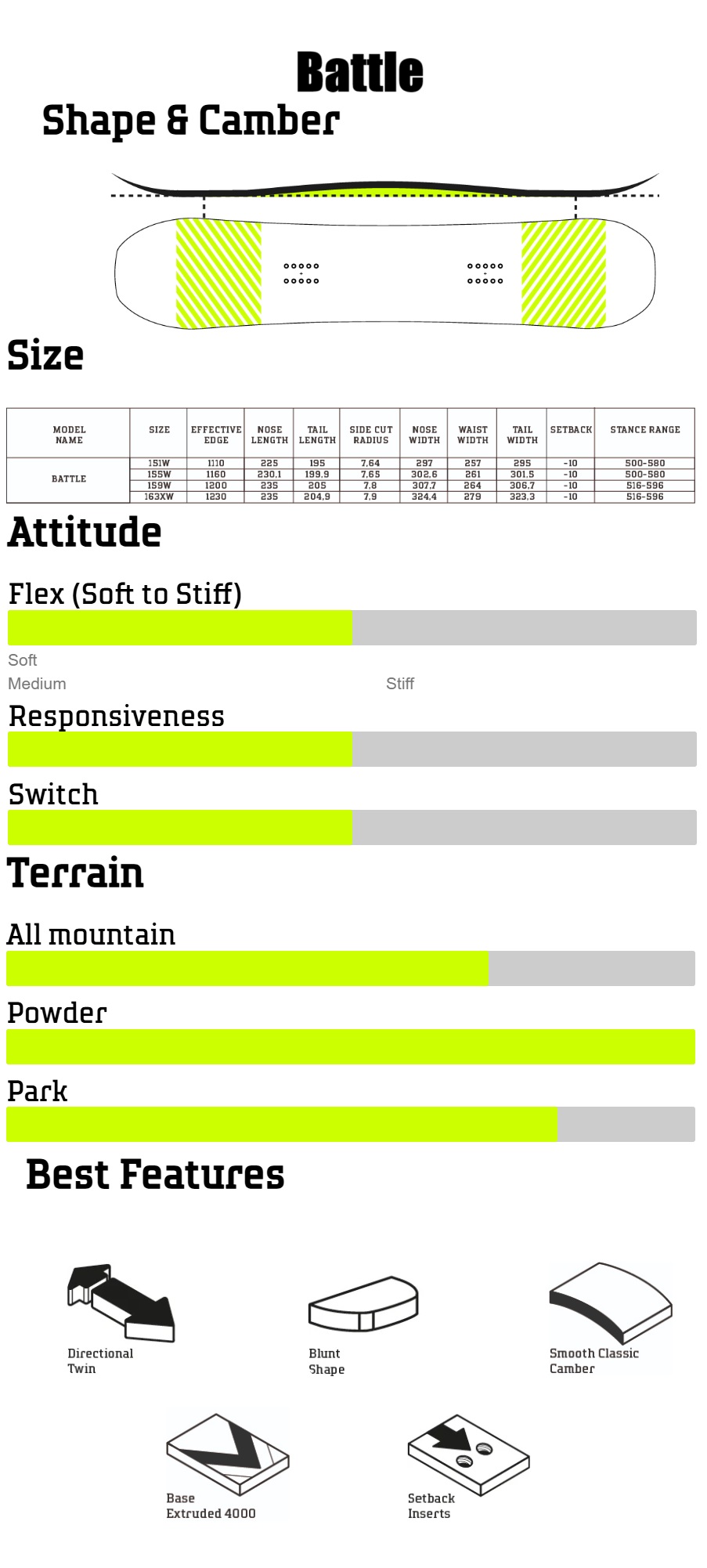 KAMPF - entwickelt, um Fahrern ein stabiles und sicheres Gefühl auf dem Board bei schnellen Fahrten oder großen Sprüngen zu geben. Classic Camber für den meisten Pop, außerdem wird eine Rille von der Nose zum Tail in den Kern gefräst und ein Carbonstab eingesetzt. Dadurch wird das Board viel reaktionsfreudiger und dynamischer, behält aber gleichzeitig die Fähigkeit zu flexen und sich zu verdrehen. Das feinste P-Tex Material wird zusammen mit Nano Carbon Partikeln gefräst, dann erhitzt, gepresst und geschnitten, um die schnellste Basis in unserer Kollektion zu schaffen.